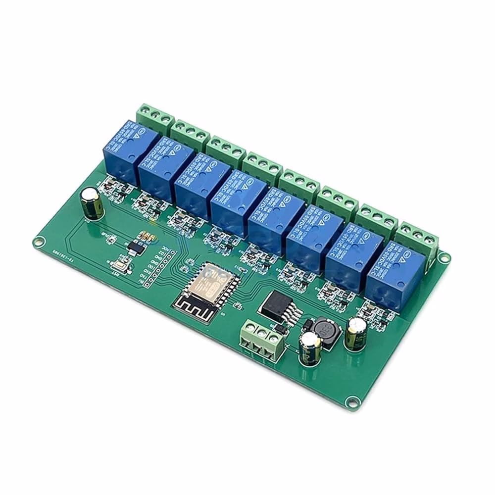 The ESP8266 eight-way relay development board is equipped with an ESP-12F WiFi module and supports DC7-28V/5V power supply. Provide Arduino development environment reference code, suitable for ESP8266 secondary development learning, smart home wireless control and other occasions.